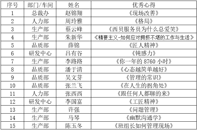 本次為第四季度讀書心得評選活動,經總裁辦校對、審核,從100多篇心得中初選出30篇,再根據主題明確、立意新穎、結合工作實際、文字通順完整等篩選出16篇優秀心得,其中獲得本季度“最佳讀書心得”得主是生產部潘靈橋《不會帶團隊,你就只能干到死》。其余優秀文稿如下: